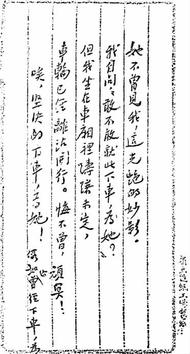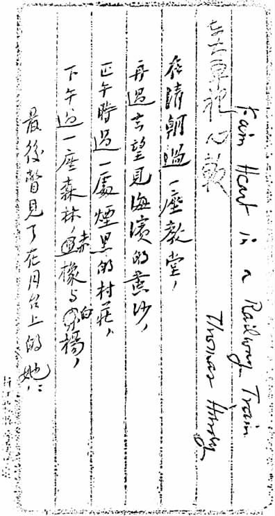 编者按:该诗已收入《翡冷翠的一夜》(【全二】二七五)。惟题目“在火车里心软”排印稿作“在火车中一次心软”,字句亦略有出入:第四行“赤橡与白杨”排印搞作“黑橡与赤杨”。第七行“敢不敢就此下车”排印稿作“你敢在此下车”。第九行“悔不曾”,及第十行“唉,坚决的下车,为她!”排印稿均无,此数字应删去。