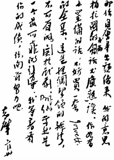 “文学不比数学,需要层次的进展,文学的园地,等于一个蛛网,你只要有文学的素养,你一天拉到了一根丝,只要你耐心的上去,你会把全个蛛网拉成一线的。我自己念书,从没有一定的步骤,找到了一本好书,这本书就会告诉你许多别的好书。我介绍你这一册歌德传,就因为这册书在我无意中获到以后,曾给了我无穷的线索。我爱这册好书,因此希望你也能在Lewis的文章里,发见歌德的伟大和念书的秘诀。”