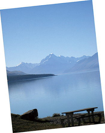 离开提卡珀湖向南去,不久看到了库克山的雪线。车又停下来,这次我们应该看有山景的湖。下了车,才发现这里比提卡珀湖更美。库克山在蓝色湖水的尽头,如一个孩子心目的将来一样无暇。我们一车的人,面对倒映着雪山的蓝色湖泊说不出话来,大多数人捏着手中的相机,已不再徒劳地想要有个人色彩的新发现。有人只好无聊地将自己微笑的脸嵌进明信片中,以自己的不完美,来破坏它的十全十美。