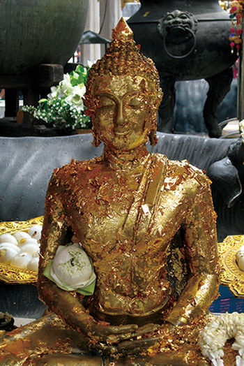 十年后,我去了曼谷的大皇宫。随着人流,我来到一尊金佛面前。人们排着队,用一片小小的金箔给金佛贴金,以示爱意。我手中也有一块小小的金箔,当我来到佛像面前,才发现,这张脸,就是我家佛像的脸——原来它是从泰国来的啊,它原来在热带如此受人爱戴。