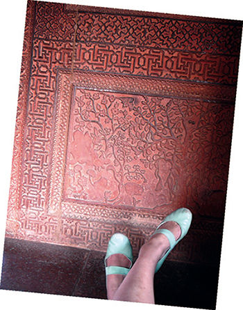 我找到了阿克巴大帝当年用的书房,在宫殿广场的一角,遥遥对着主殿,远离后宫。那玲珑凉爽的红砂石书房有种不可思议的熟悉。虽然室内的家具已荡然无存,但我的身体一旦静下来,还是能感受到,面北向南的一边,放张长长的花梨木书案正好合适,后面可以置上一排花梨木的书架。门旁边的那块地方,正好放下一排搁宝架,陈列小巧的书房玩物,比如玉做的如意,白瓷的笔洗,琉璃的鼻烟壶,竹雕的镇纸,象牙的八仙彩雕像,这就是个中国文人书房的传统空间。