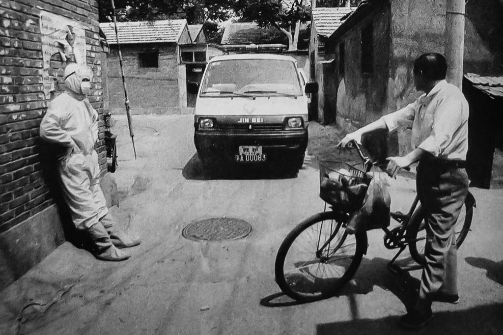 二〇〇三年五月,北京东城区草厂东巷,一名医务人员正在等待接受一名“非典”疑似患者。(CFP图片)