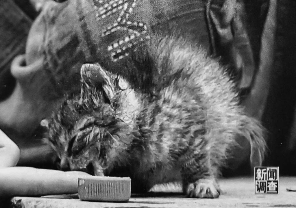 二〇〇八年五月,北川杨柳坪村。我们送文超的牛奶,他倒在矿泉水盖里,用手指蘸着喂这只小猫。它细弱的连路都很难走,村里人都说它活不了,孩子说他也这么想,但他想养活它,“它也是一条命”。(图片来自视频截图)