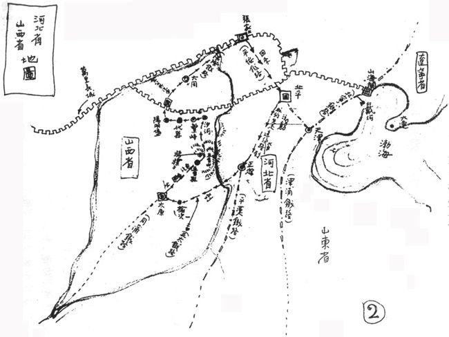 注意万里长城,太原,五台山,代县,雁门关,大同,张家口等地方,及平汉铁路,正太铁路,平绥铁路,你就可以明白一切。