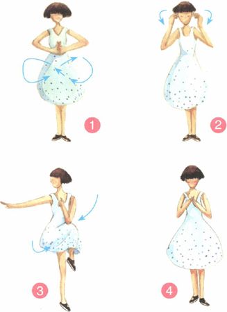 然后,她站立着,两支手臂打开向上,在手肘处弯曲。然后她用右手肘,去碰触抬高的左膝盖,身体自然向左侧转,回到原位后,再用左手肘去碰触抬高的右膝盖,身体自然向右侧转。她的动作轻柔缓慢,嘴里还是说着:“我为我的幸福快乐负责。”也是三十秒,“这个动作是利用你的动觉、动感、把正面信念植入你的身体、潜意识之中。”农家女补充。