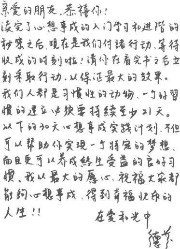 我特别提出这一点,是因为很多人以为心想事成可以用来操控别人:让花心的老公回心转意,让不听话的孩子变乖,让老板脾气变好。这是一个错误的幻想。心想事成的原理是吸引力定律,是你本身散发出来的频率在吸引人、事、物来到你的生命当中。如果我们发愿、祈求、观想,都是在要求别人作出改变,这是不切实际的。会相信心想事成,并且愿意实行的人,都应该知道:我们外在的世界是我们内在的投射,外面没有别人。(参考我的第一本书《遇见未知的自己》)。所以,写下我的梦想句: