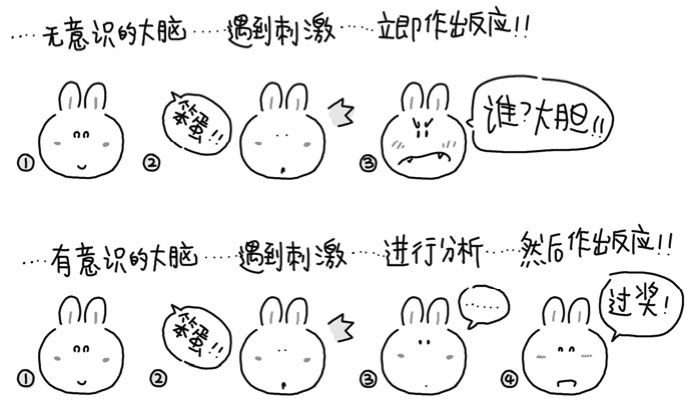我们用下图来描述“无意识地受大脑控制”与“有意识地控制大脑”之间的区别。