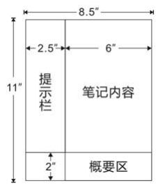 · 提示栏:当你做笔记的时候,让提示栏保留空白。演讲过后,简化你的笔记使之成为简明提示以供日后记忆、回顾和消化(思考)之用。