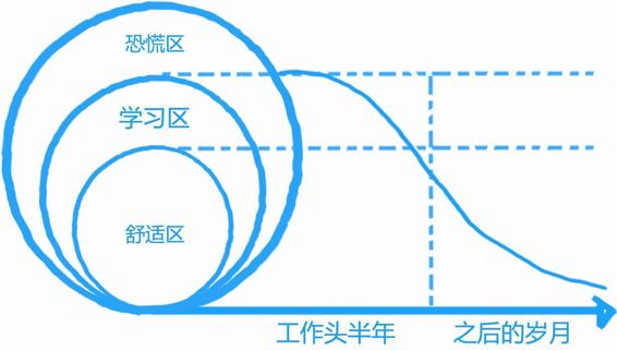 心理研究表明,人类对外部认识可分为三个区:舒适区(comfort zone)、学习区(learning zone)和恐慌区(panic zone)。在舒适区,得心应手,每天都做熟悉的事情,接触熟悉的环境和熟悉的人。到了学习区,会接触到新事物、新方法、新项目。此时,在有点新奇的同时,也会有新的焦虑,因为在这些新事物之中,还带着新要求和新压力。恐慌区则是压力最大的地方,这里边的要求你连想都不会去想。