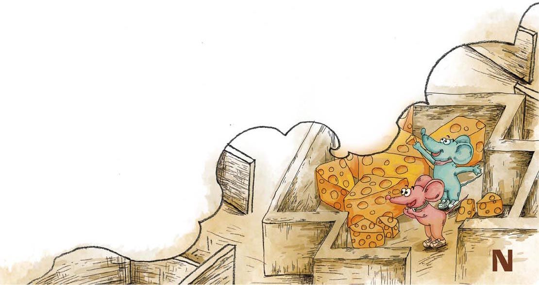 然后,唧唧小心翼翼地把脑袋伸出去,紧张地看着外面的迷宫世界。他开始思考自己是如何沦落到这种没有奶酪的境地的。