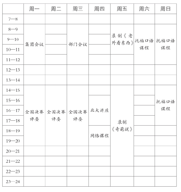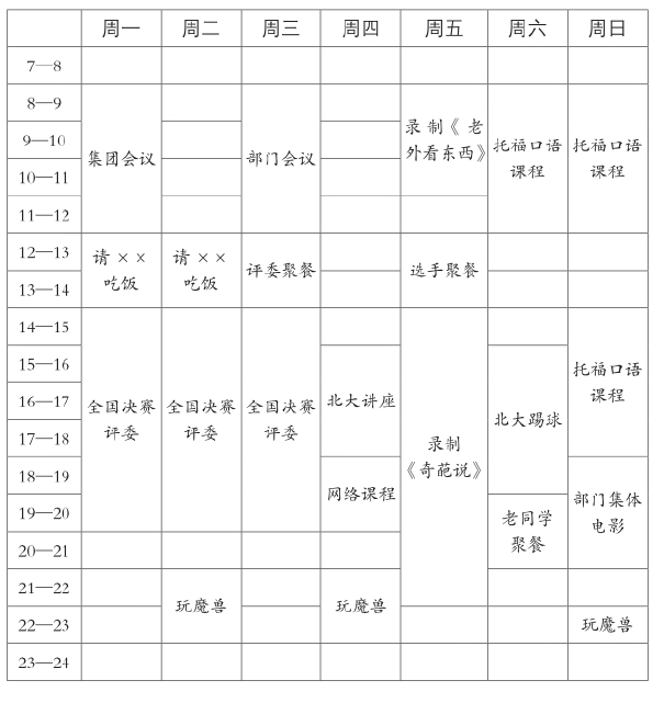 我在新东方的一位同事曾经因为连续上课,感觉自己没时间进修和娱乐,一度郁闷到想辞职,来一场说走就走的西藏旅行,或者去丽江开个茶馆。他跟我说,每天就是上课、备课、上课、备课的循环,真没意思。“咱先别一下子抛开一切,生活我们是逃避不了的。如果你想有一些自己的娱乐学习时间,不如你按照我说的来做。”我帮他做了逆向时间规划,当时的他露出了怀疑的目光。