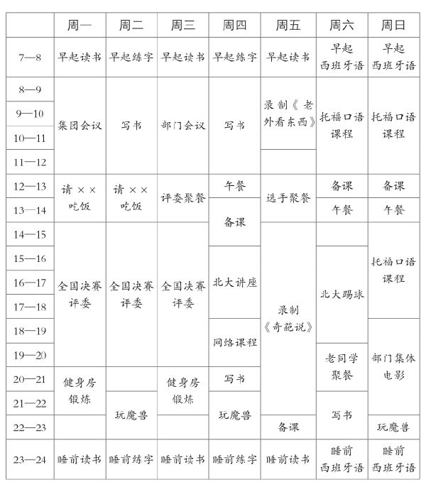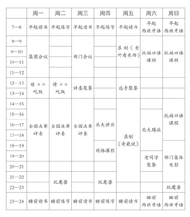 这样的时间表,会让你先看到自己有充足的娱乐休闲时间,从而对这一周充满了期待。那么,每天叫醒你的是梦想,而不再是责任。