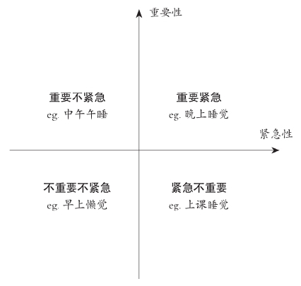 比如睡觉,晚上11点非常困,这时候睡觉是重要又紧急的事。重要是因为对你的身体健康有益,紧急是因为已经很困撑不住了。什么是重要但不紧急呢?中午睡午觉。重要是因为午觉会让下午精神抖擞,不去睡觉则会导致之后的工作状态很差,不紧急是因为很多人中午并不困。早上9点,你已经醒了,仍然赖在床上,这是既不重要也不紧急的事。不重要是因为这时候睡觉对健康并没帮助,不紧急是因为你其实也不困。这种既不重要又不紧急的事,我们生活中其实做了很多,很浪费时间,也会导致时间利用效率的下降。