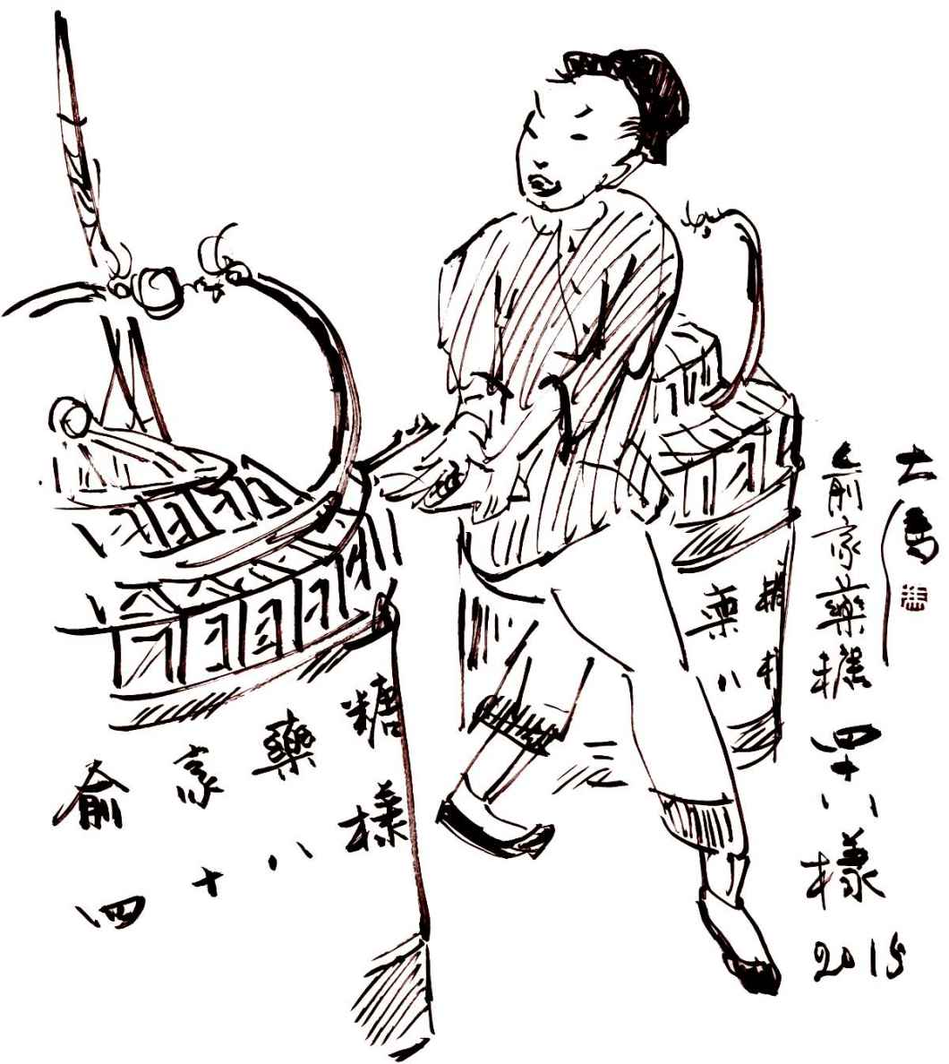 院中间放一个挑儿,一根扁担,两个桶柜,柜子上是一圈放药糖的小方盒,每个盒里一种糖。盒上边有个盖儿,带合页,可以掀;这一圈小盒总共二十四个,两个桶柜正好四十八样。