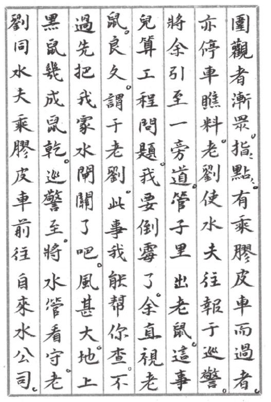 巡警收拾了死老鼠,抱怨个不停:“守着水龙头,从没安生过,不是水三儿打架,就是有人偷水管。”
