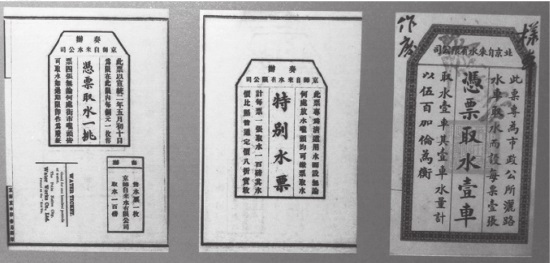 除了安装家庭专线,京师自来水公司为了推广自来水,在城内安装了很多公用龙头,早6点到晚6点开放,供居民买水,并提供送水上门的服务。为了管理这些龙头,雇佣了专门的水夫看管,被称为“售水夫”。图片是用来买水的水票和水筹,在不少商店可以购买,一枚铜板买四张水票,每张票换水一挑