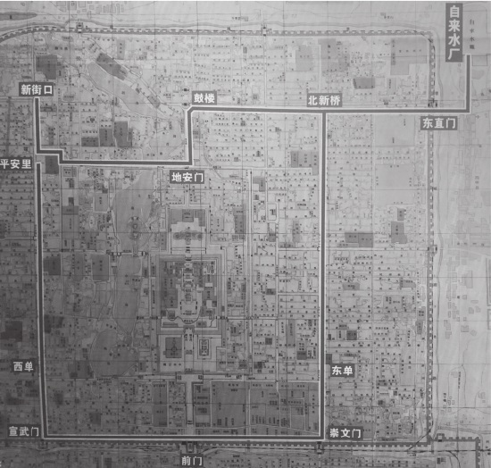东直门水厂建立之初,往北京城开了两条主管道,把外城绕了一周,城里的住户在家里装专线,就从主管道接分管道。地下管道直径约400-450毫米,分管道直径约150-200毫米。皇城内并未通自来水,因为自来水厂是民营企业,未经政府批准,不得从事与皇室有关的经营活动。图片来自北京自来水博物馆