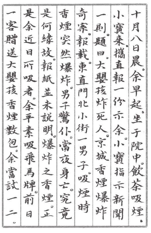 10月18号早晨,我起了个大早,坐院里喝茶抽烟,小宝给我送来一份《直报》。小宝指给我一则新闻,我一看标题,马上掐灭了手里的烟:大婴孩炸死人,京城香烟爆炸奇案。
