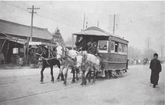 那天下午,我们俩一出奉天站,就见到一辆马拉火车呼啸而过,登时惊呆了。三匹白马跑在车道上,一名车夫鞭子舞得啪啪响,后头拉着一节火车车厢,车厢里坐着二十多个人。