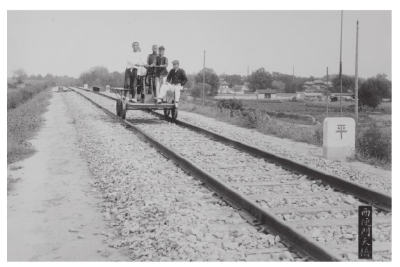 手摇车,就是人力轨道车,是19世纪出现在欧美的一种微型无动力机车。这种车有四个轮子,利用杠杆、曲轴和齿轮等机械装置驱动,时速可以达到20公里,通常由2——4个人,前后握住杠杆交替轧动就可以行驶。图片是1900年的京张铁路西便门附近,工人驾驶轨道车前行。引自上海同生照相号1909年拍摄发行的《京张路工摄影》