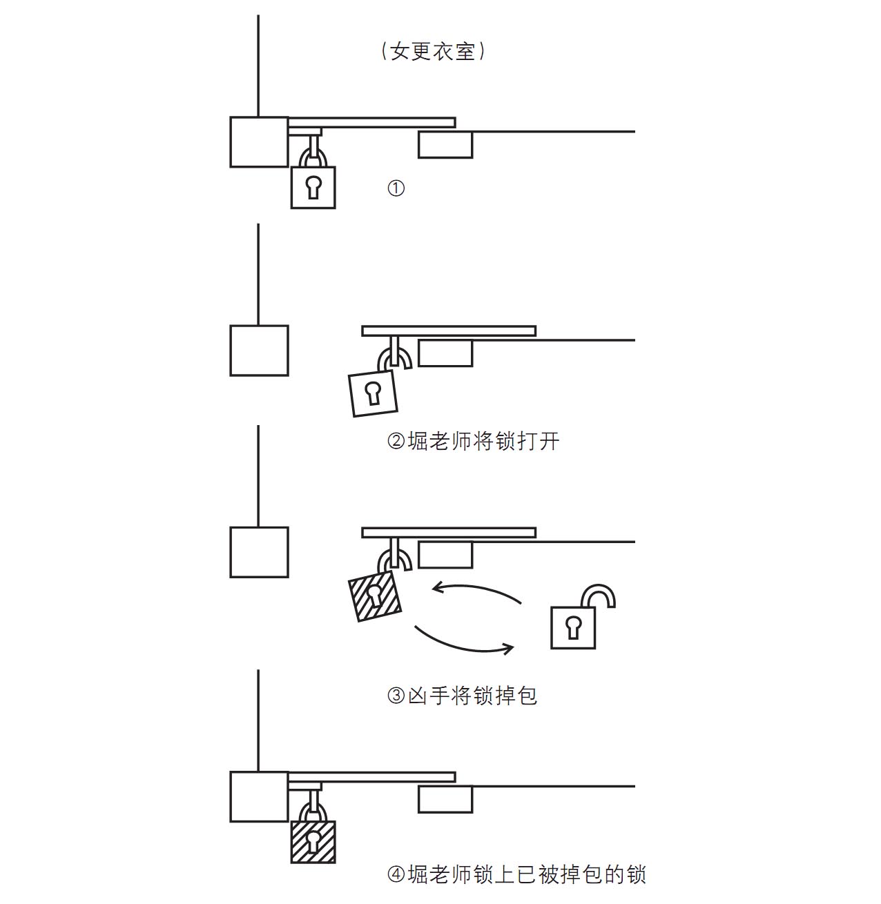“接下来就简单了。”雅美说着,拿出另一把钥匙打开门上的锁,“打开锁后,凶手在男更衣室里和村桥老师见面,设法骗他服毒后,用木棍顶住门,再翻墙从女更衣室逃走。当然,这时……”她拿出另一把锁,“门上挂的是原来的锁。这样,更衣室就成了天衣无缝的密室。”