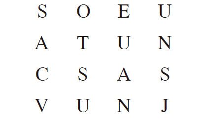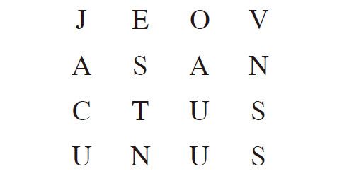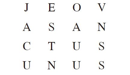凯瑟琳·所罗门又看了一遍字母格,反复琢磨其中的意思。毫无疑问,在她眼里,有个拉丁词汇突显出来了。Jeova。