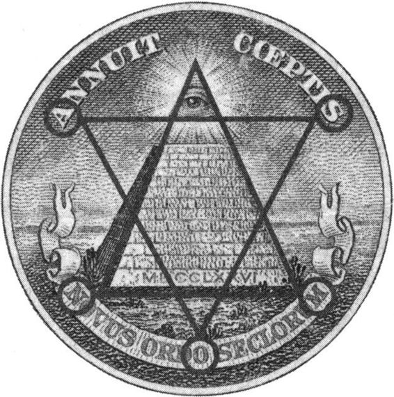 “瞧,”她把纸钞摊平放在大腿上,接过他的笔,指着背后的国玺图案。“如果你把所罗门封印叠加在美利坚合众国的国玺上……”她在金字塔上画了一个犹太六角星的符号。“再看看结果!”