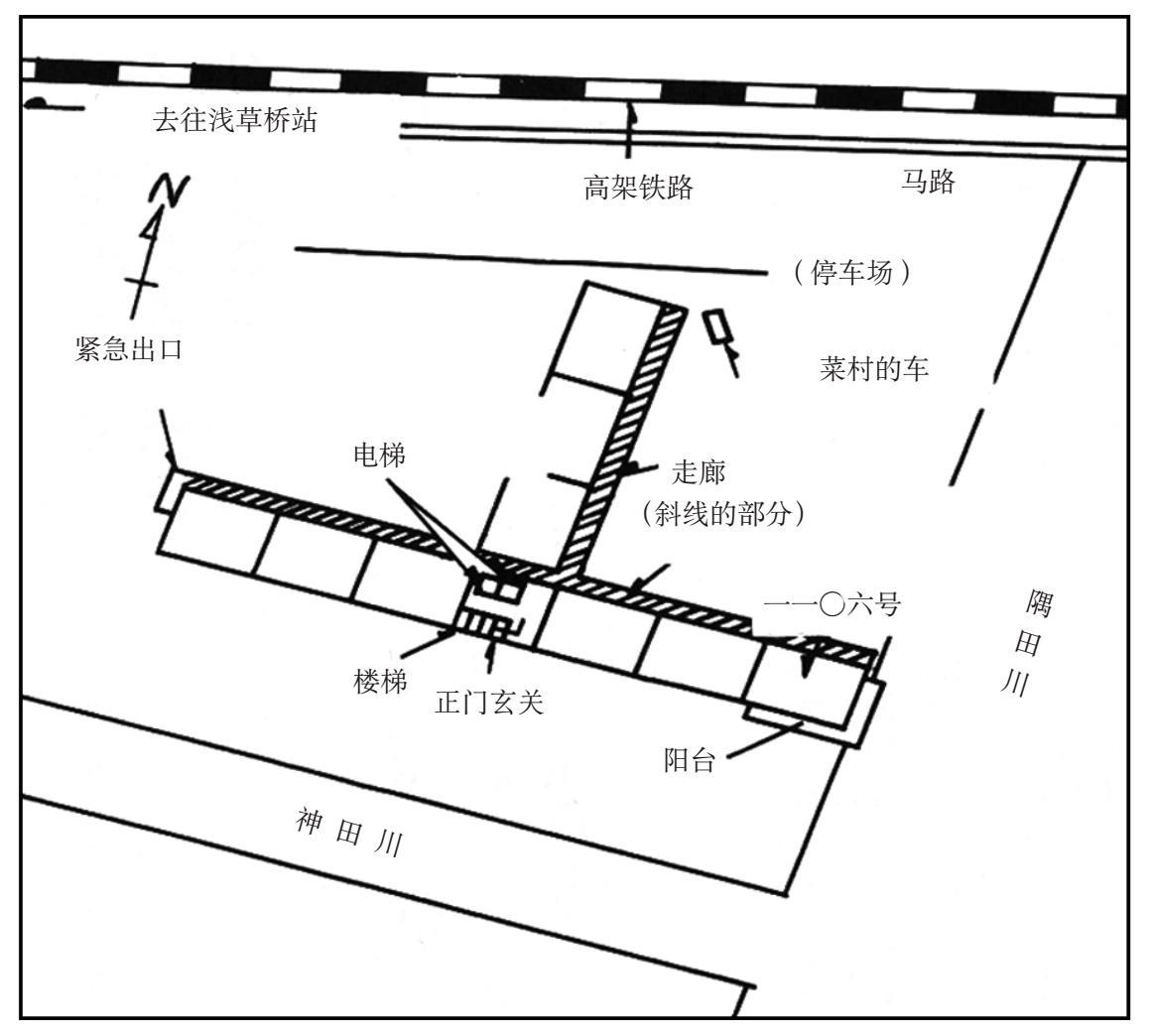 站在走廊尽头的一一〇六号室前,可以看到下面是因台风而水量暴增的隅田川。在十一层听到的风声,比下面的更加凄厉。