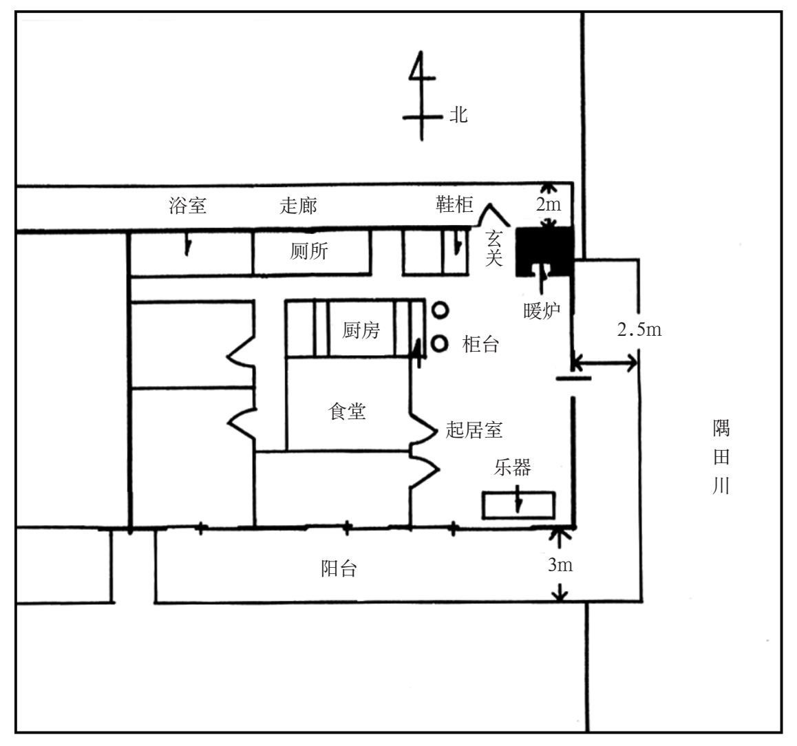 这个房间是在公寓的拐角,阳台也顺着房子的布局折成L形(图三)。如果走到东侧向下看,就能看到浊流翻腾的隅田川。但是走到那边就一定会被淋湿。