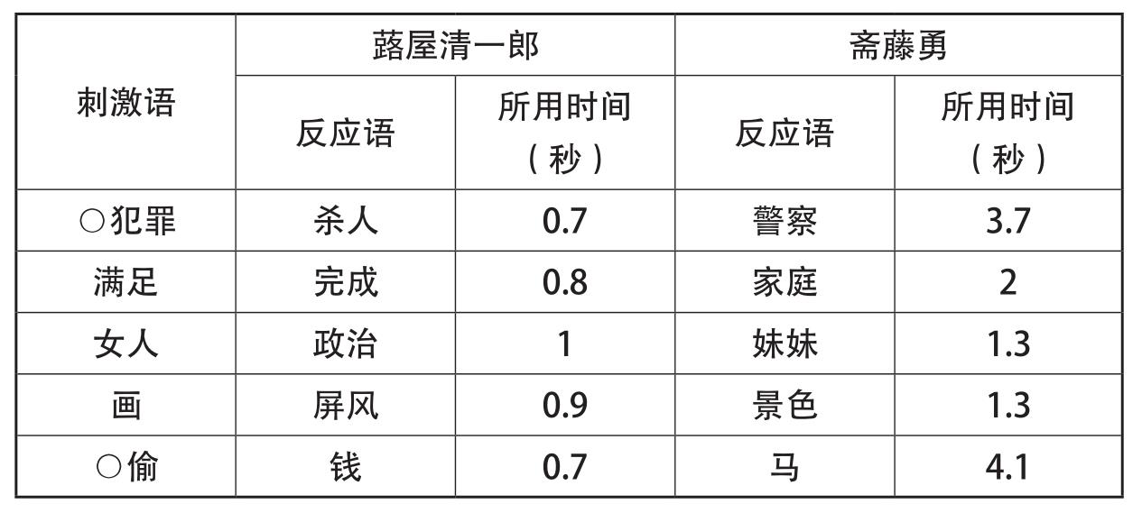“你看,非常明显吧!”判事待明智看完测试记录,继续说道。“从记录可以看出,斋藤耍了不少花招。最明显的就是反应时间过长,不仅出现问题的词用时很长,甚至对之后的一两个词也产生了影响。另外,听到‘钱’回答‘铁’,听到‘偷’回答‘马’,联想相当勉强。对于‘花盆’一词的回答用时最长,恐怕是为了不说出‘钱’或者‘松树’这两个词,花费了不少时间吧。与此次相对,蕗屋的反应却相当自然。‘松树’对‘花盆’,‘藏’对‘油纸’,‘杀人’对‘犯罪’,作为犯人本该极力隐藏的联想,他却十分自然地答了出来,而且用时很短。如果他是真正的杀人犯,却还作出如此回答,那绝对是智商有问题。不过他可是××大学的学生,而且相当有才华!”