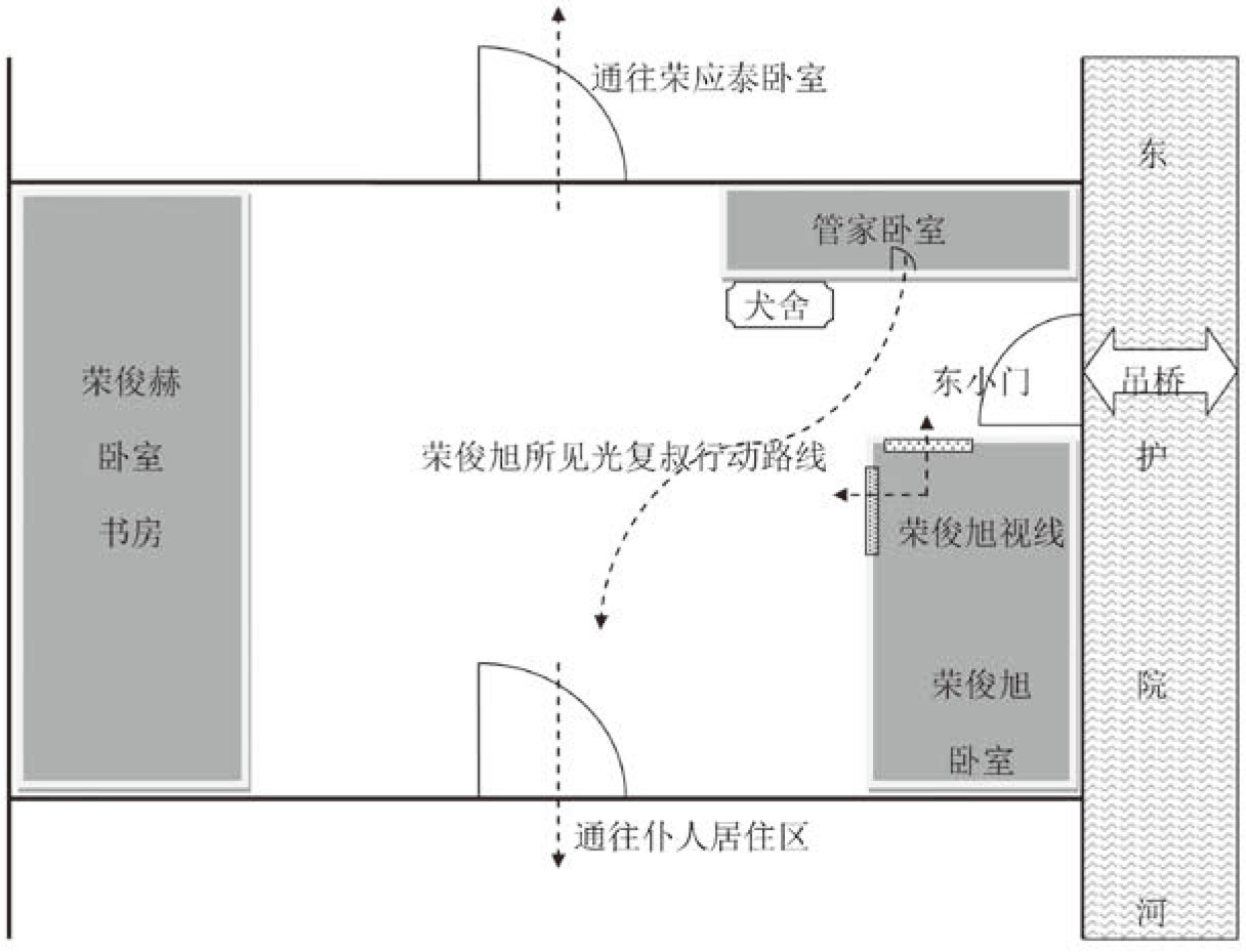 倘若凶手出门时穿着与死者相同的衣服,假冒成光复叔的样子,从荣俊旭的窗前走过,那么在深夜里,即使荣俊旭对光复叔再熟悉,也无法明辨真伪,更何况是在没有心理准备的情况下。那么,凶手的行动路线就合理了。他可以堂而皇之地保持光复叔的姿态走出四合院区。