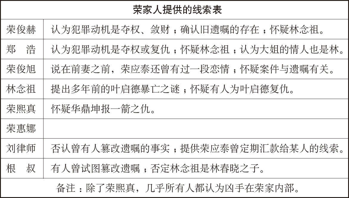 王亮说:“我觉得第一种观点,也就是针对遗嘱下手的可能性最大。荣应泰的死,是整个案子的转折点。既然他死了,那么前面那两桩案子的疑点,包括装神弄鬼的那些事,可能都是凶手为了成功杀死荣应泰所铺垫的假象。在巨大的利益面前,复仇说和恩怨说似乎都变得不堪一击。毕竟,这些利益,或者说权力,足以改变在此局中的任何一个人的一生。”