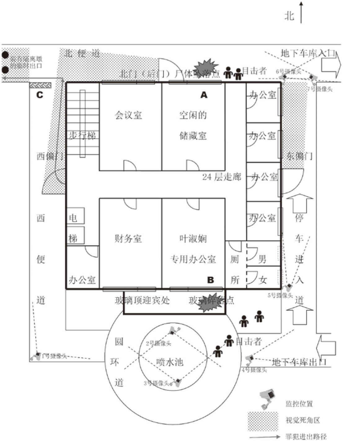 “二十四层叶淑娴办公室的南窗碎了,玻璃散落到一楼南门前的玻璃顶上,然而我们发现,叶淑娴却落在了北门,而且尸体还恰好砸到自己的专车上。整幢大厦的玻璃窗,除了每层公用厕所有两个可以开启但人体不能通过的小窗之外,其余都是全封闭固定的,不能开启。与尸体坠落点垂直对应的A点二十四层储藏室玻璃完好,没有破损迹象。两个房间分别在南北两边,中间还隔着走廊。简单地说,叶淑娴被人打破南窗推下,尸体却落在了北门。天台装有高高的护栏,很难被自由翻越,大厦的各个位置都没有出现擦玻璃用的升降机,而别的楼层玻璃完好,没有被破坏的迹象,因此,凶手不是利用天台或别的楼层来制造这个奇迹的。还有一点值得注意的,大厦内外的监控摄像头,竟然没有一个拍到凶手的。一帧画面都没有。问题出来了,凶手是如何做到这一切的?”