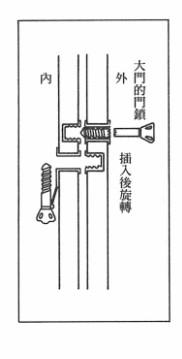 内外两侧都是扭入式门锁。但内侧是使用于一般拉门、用螺丝栓紧固定的螺丝锁,外侧的锁并非螺丝锁,而是需要钥匙插入锁孔的款式。至于厨房里的后门,安装的则是与大门内侧同样款式的门锁。因此,后门也同样从内侧锁上后,就无法由外侧开启。为求慎重起见,在此必须再补充一句话,亦即,这扇后门无法从外侧锁上。