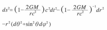 对于这种具有10个独立成分的系数gij的联立偏微分方程式属于非线型方程式,因此无法以一般的解法来解。所以,史瓦西以‘在真空中的方程式,时空必须以球对称,而且没有时间上的变化’之特别状况为条件来解题,结果,其严密解法的答案如下:
