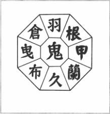 “主要在于加法和减法!那只是藉着在周围八个文字加上或减去中间的鬼字,让人名浮现而已。我之所以发现,乃是因为注意到八个字之中,部首为‘厶’的字有四个,而且,中央的鬼字也一样。于是,这绝对有某种关系存在,才终于解开谜团。减掉鬼的宏是久,加上鬼的市是兰,减掉鬼的么是甲,加上鬼的木是根,减掉鬼的亿是羽,加上鬼的人是仓,减掉鬼的厶是曳,减掉鬼的的口是布。节字的巾当成门的简体字虽然有点勉强,不过以鬼字为中心,我个人觉得已经相当不简单了。我就把这些恢复为容易了解的图形吧!”