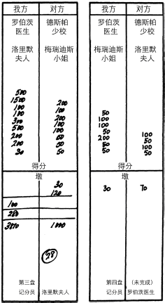 “第三轮由洛里默太太记分——她和罗伯茨医生搭档对抗另外两人——争夺非常激烈,双方的分数轮番上涨。医生叫牌叫得太高,最终未能得手——但他们两位都是一流高手,所以一直没落后太多。如果医生过高的叫牌引得对方也轻率叫牌,他们就有机会通过‘加倍’锁定胜局。看,这些数字是没打成的加倍牌。字迹也很有特点,优雅、清晰、有力。