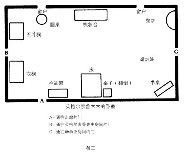 我们一起朝发生悲剧的那个房间走去。为了方便起见,附上一张房间和里面主要家具摆设的平面图(见图二)。
