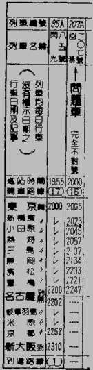 “闪光六十六号是十九点五十五分到达东京。如果这时利用国电,会走向旧东海道线,所以无法赶上后来的回音一六六号。为了能搭乘上行的新干线,再怎么样都要利用下行的新干线。以这种角度来看新干线,二十点零五分有回音二○七号开往名古屋,这班车全部不对号。如果是这班车,到达新横滨时是二十点十三分,就有足够的时间改搭二十点四十分到达新横滨的回音一六六号。当然,也可以考虑从东京坐汽车赶去的方法,但在不到五十分钟的时间里,想到达横滨非常勉强,也容易被查出行踪。如果要回去的话,我认为只有用新干线回去。”