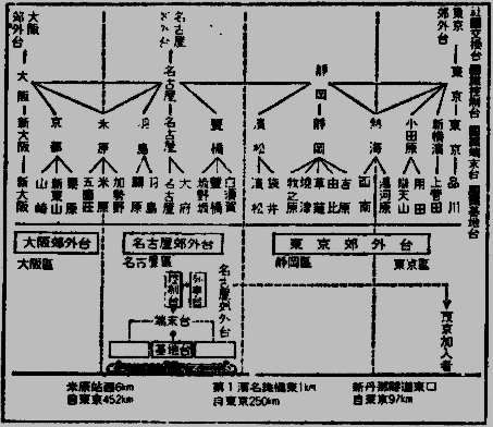 “为了便于了解,我们来画张图。”大川把随便记在笔记本上的东西又重新写好。“我刚才打电话问电信局,才知道东京到大阪间的列车公共电话,为了订定通话费用的标准,把发话列车的位置分成东京、静冈、名古屋、大阪四个地区,从群里以导线依总局→控制局→市外局列车台→加入电话(通话者)的次序传送。这时候市外局有一定的作业范围,名古屋市外局如这一张图:从第一滨名铁桥东方一公里(从东京算是二百五十公里)处,到米原站西方六里处(从东京算是四百五十二公里)处,共有二○二公里的区域。我这么说明大家大概已经了解了。冬本打电话在十七时二十二分左右,回音一六六号的位置在京都与米原之间,而且是相当靠近京都的地点,由大阪市外局作业。可是,冬本的电话是经由名古屋电话局转接,这表示冬本在十七时二十二分时,并没有在回音一六六号上。在这段时间,他在名右屋电话局作业范围的二○二公里内。”