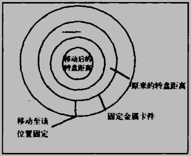 即使表盘数字都顺序往右转方向(顺时针方向)挪动一个数字的距离,拨打0时,还是输出0的脉冲,没有任何作用。如果将金属卡件往逆时针方向移动一个孔眼的距离,虽然由于转盘距离变短,可以产生预期的错觉,但是打孔安装的难度很大,所以金属卡件不能动。