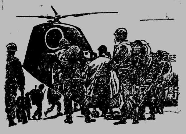就在这一天,队员们在习志野集中,分乘两架运输用直升飞机V—107,飞往失事地区。