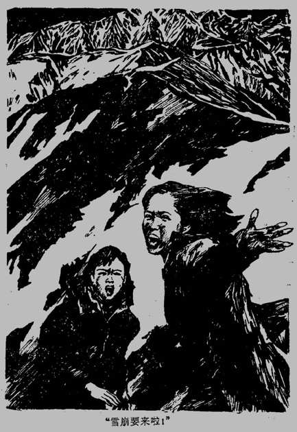 在巨大的雪块下,雪崩前还好端端的两间屋子已经见不到一丝痕迹,只留下散落在四周雪地上的木板碎片,显示出这之前曾经有过屋子。在微蓝色的雪光中一片惨象,告诉人们刚才这场雪崩灾难并非梦境。但大家仍象经历了一场恶梦似的不能相信眼前的情景是真的。在这倒塌的屋子底下是些行动不便的老人,阿作老爹犯风湿半身不遂,阿松老头中风卧床不起。