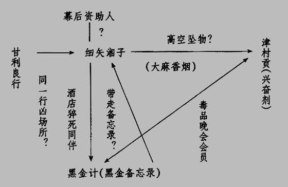 毒品(黑金是大麻晚会会员、津村家中搜出了兴奋剂、细矢跑车内发现大麻香烟)、黑金与细矢、黑金与津村、细矢家恰好位于津村尸体正上方,鉴于以上诸多因素,警方推断认为,这一系列事件不可能毫不相关,其相互间的关系如下图所示: